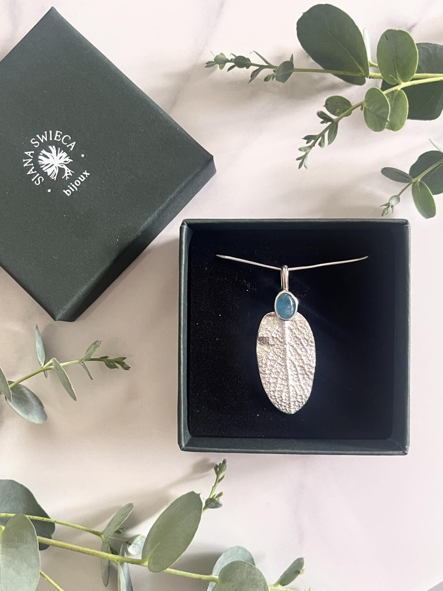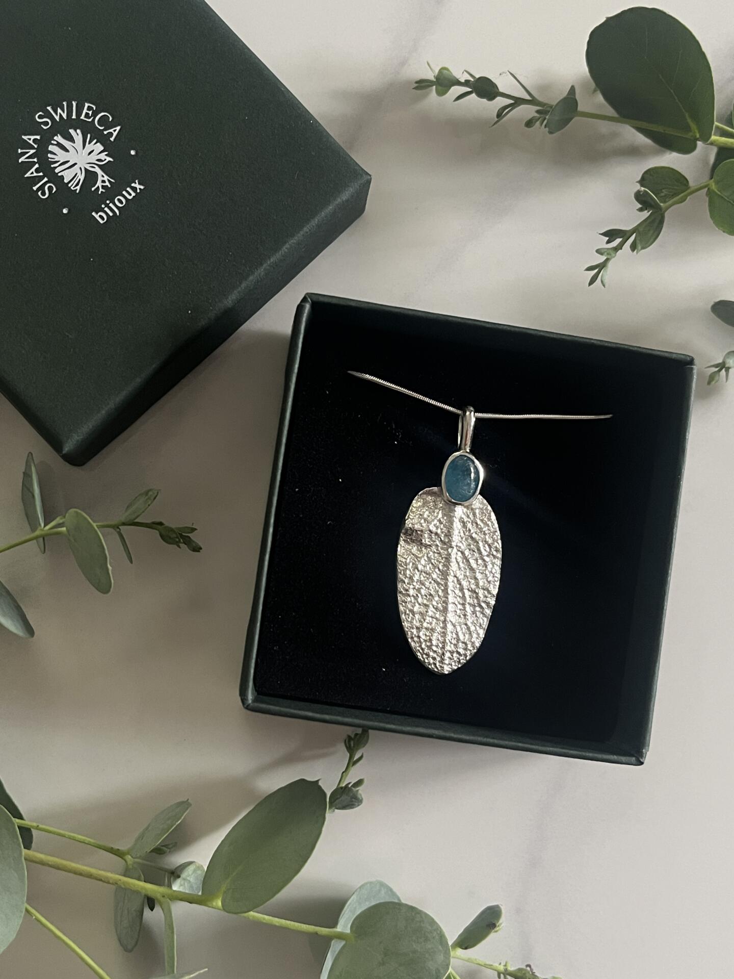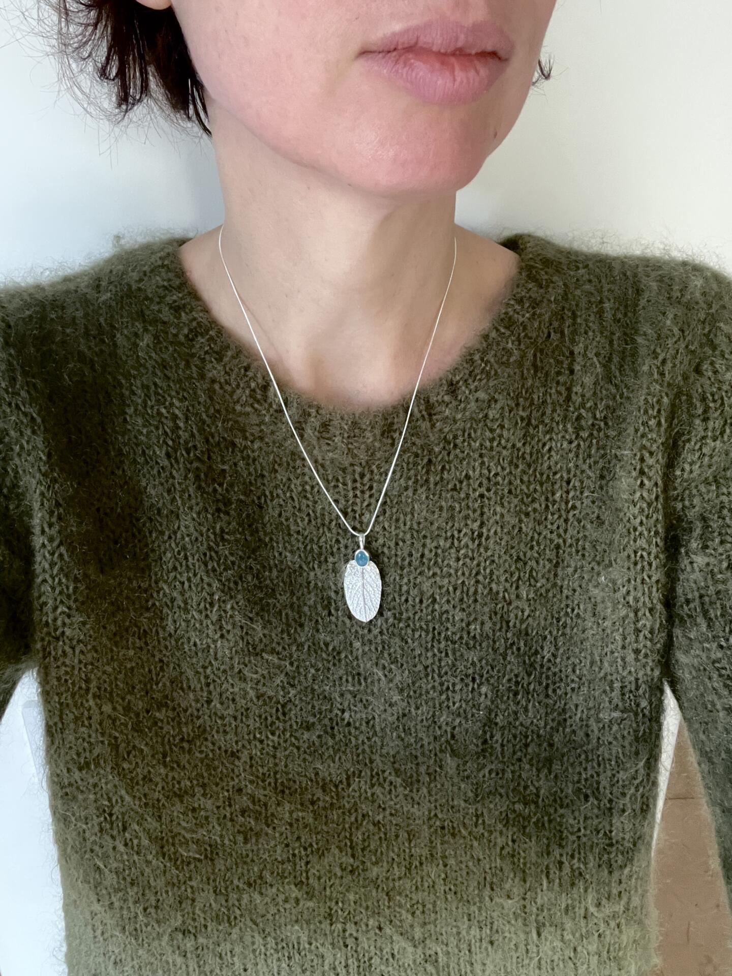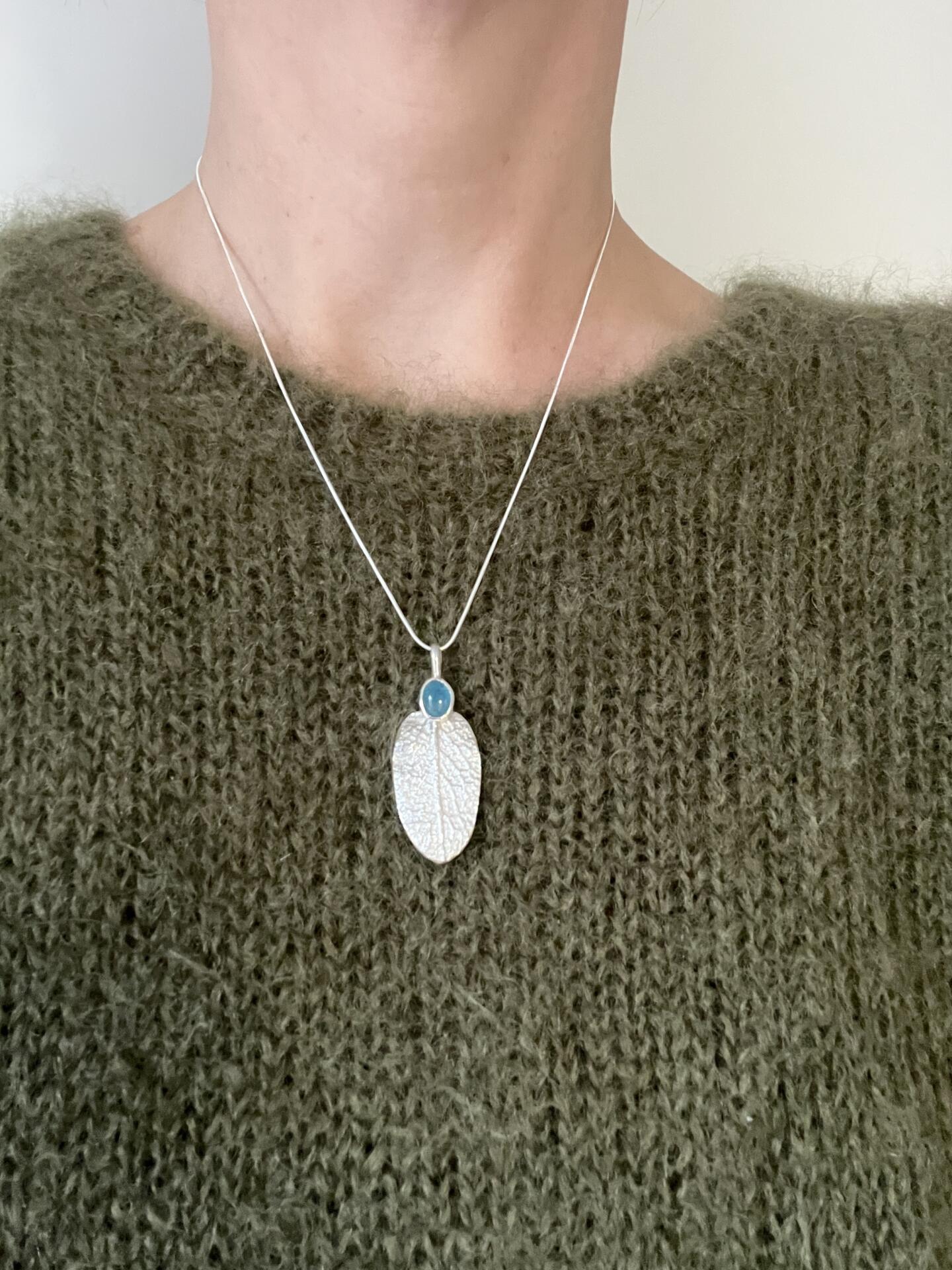Collier à l’empreinte de feuille de sauge et pierre Apatite