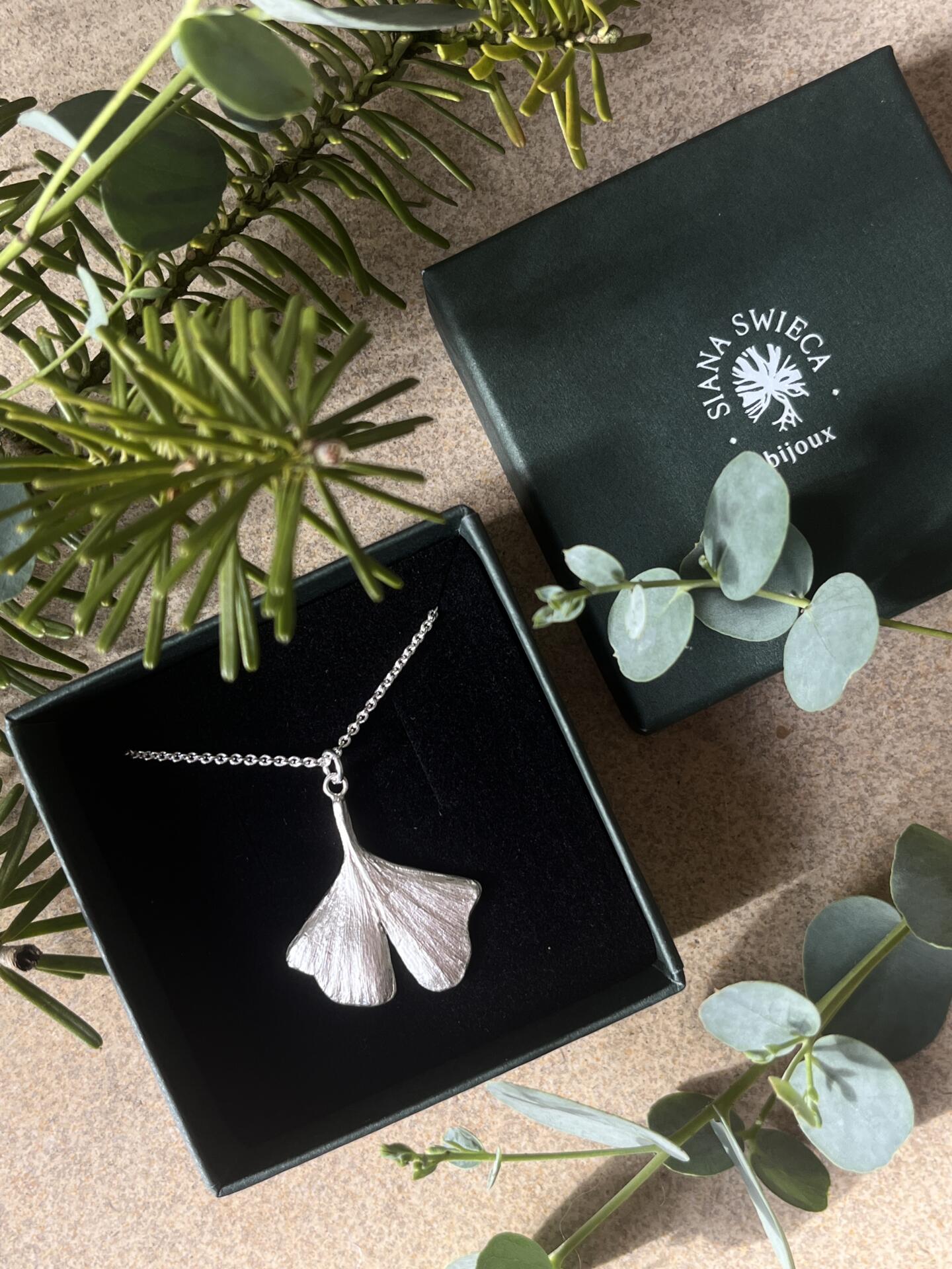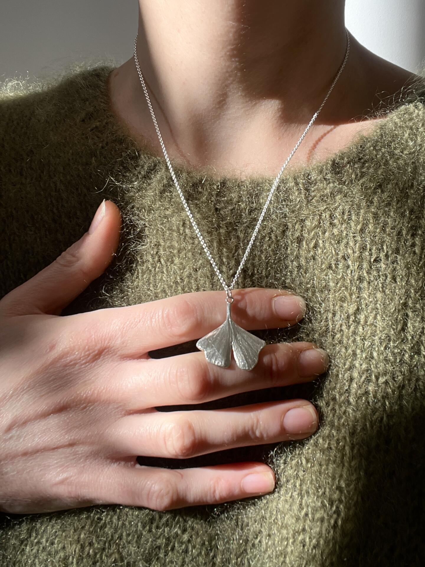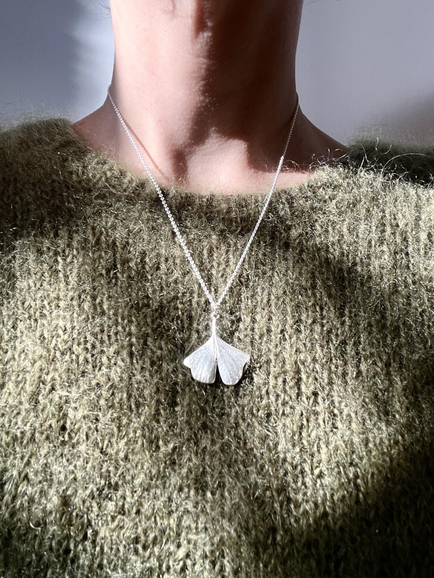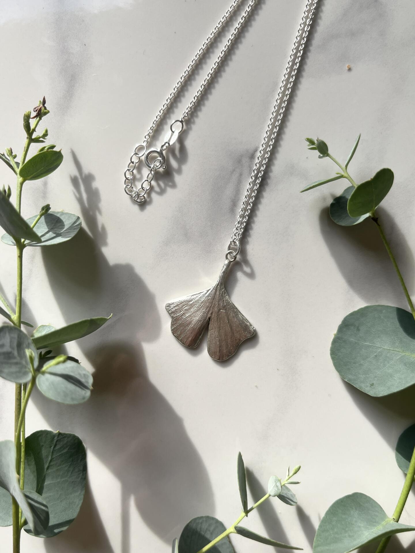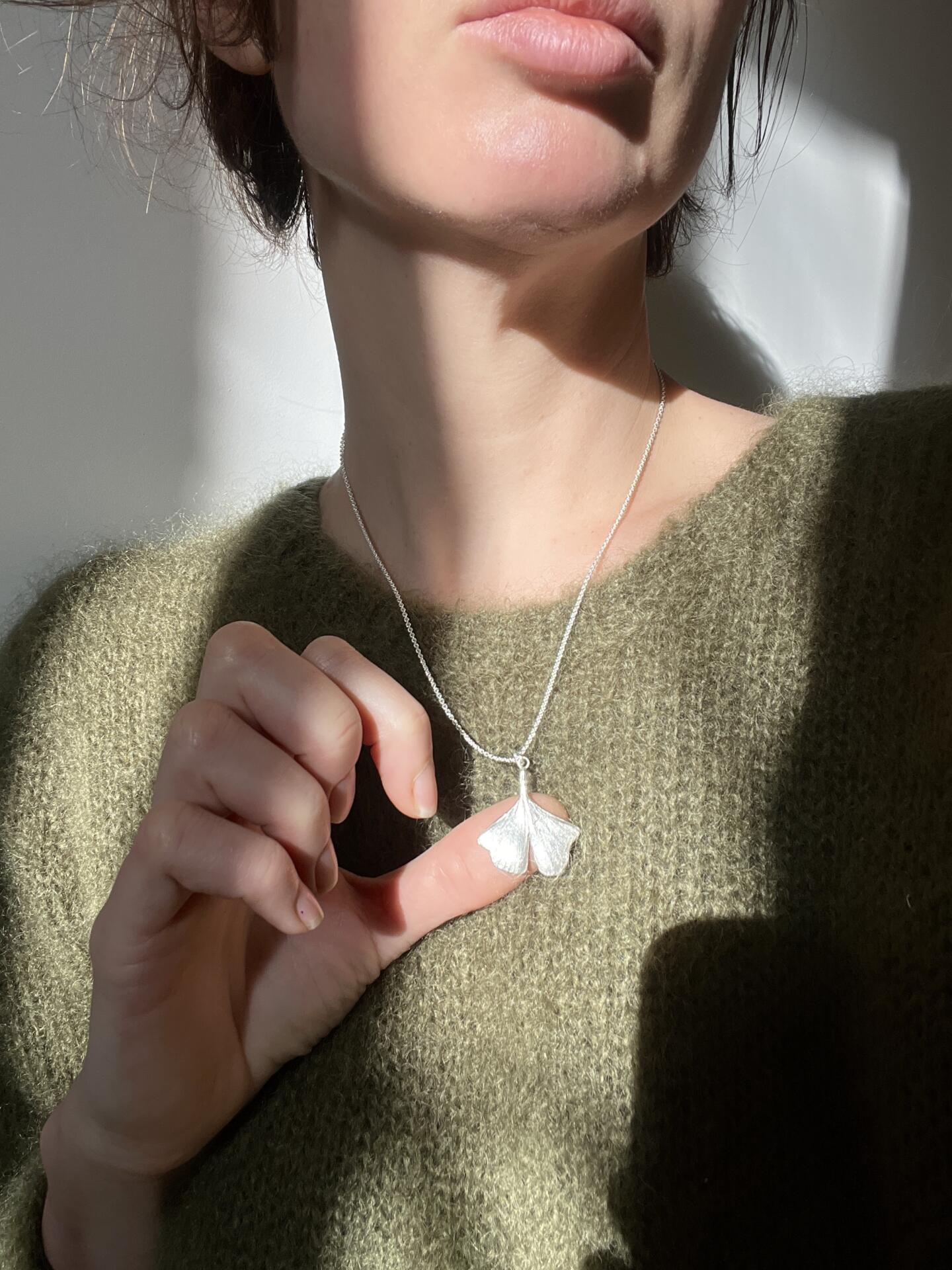 ► Collier réglable en argent 925 recyclé, réalisé à la main dans mon atelier à partir de l’empreinte d’une vraie feuille de Ginkgo